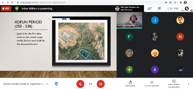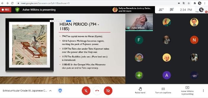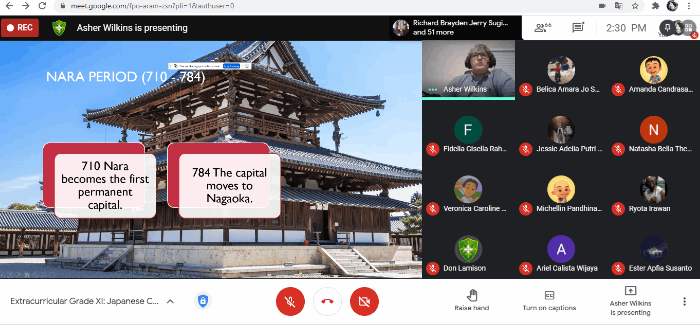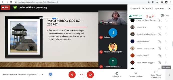 Materi pembelajaran di berikan langsung oleh pengajar dari UGE Amerika yang bernama Mr Asher Wilkins secara on-line melalui Google Meeting. Karena pengajarnya adalah seorang English Native Speaker, jadi pada kegiatan ini, anak-anak bisa mendapatkan 2 ilmu sekaligus: belajar sejarah dan budaya Jepang, serta memperlancar kemampuan Bahasa Inggris mereka. Kegiatan belajar yang dilakukan bersifat interaktif, sehingga anak-anak akan lebih aktif beraktifitas selama pembelajaran.